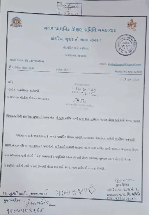 Another letter was sent to the police station 12 days ago with the subject “Fire in School.” The headmaster of Municipal Corporation School Number 1, situated on Kantodiya Road, wrote a letter to the local police station’s PI (Police Inspector). In the letter, it was reported that the local antisocial elements from the Kantodiya neighborhood have been causing disturbances in the school’s field and the surrounding compound. These antisocial activities have not only resulted in damage to the school but also pose a security risk. The letter requested police intervention to address these issues, and it was sent 12 days ago. Despite notifying the police, no action has been taken to date.